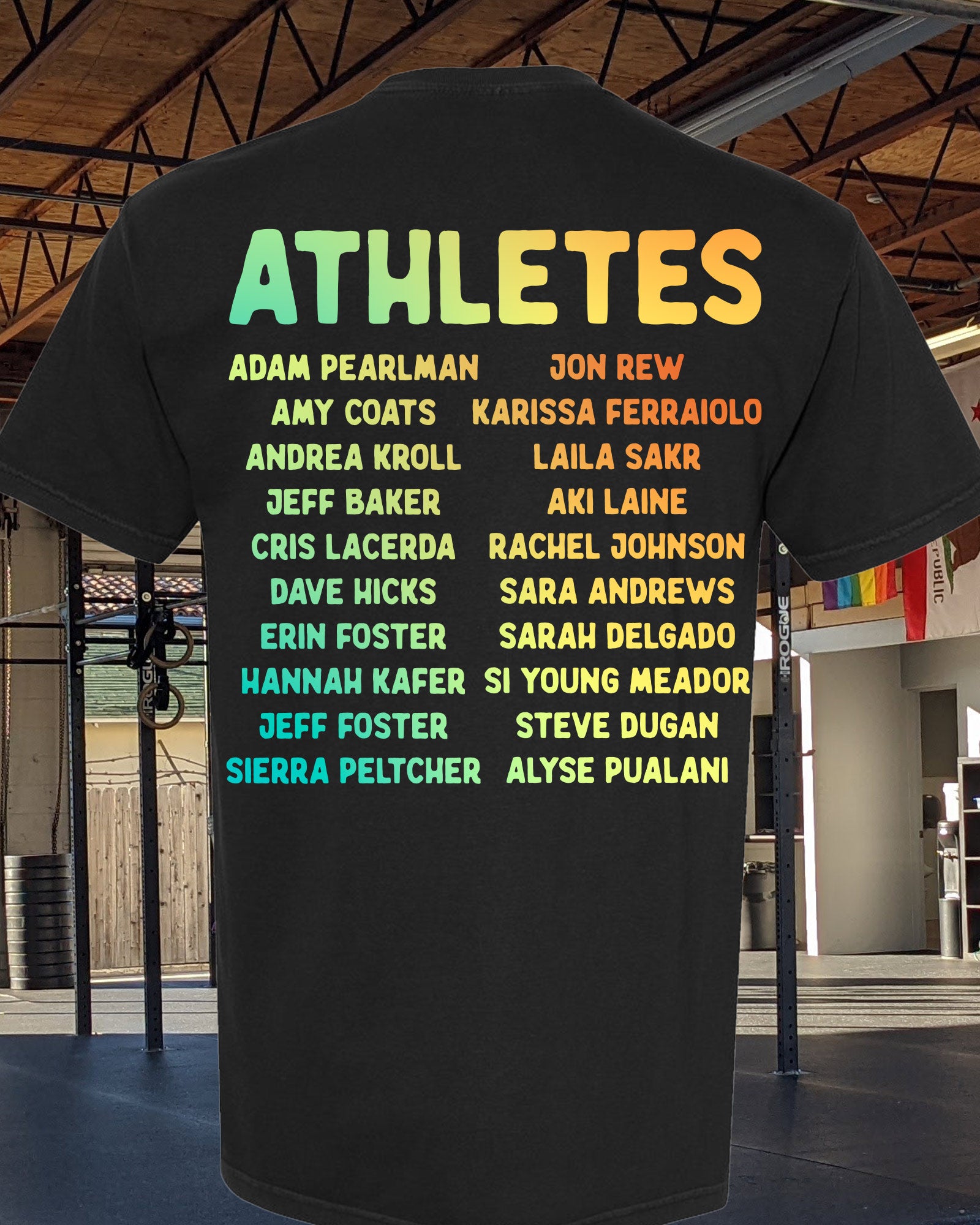 Heatmap gradient design with Wodapalooza athletes names on the back! You can select tank or unisex tee and white or black.
